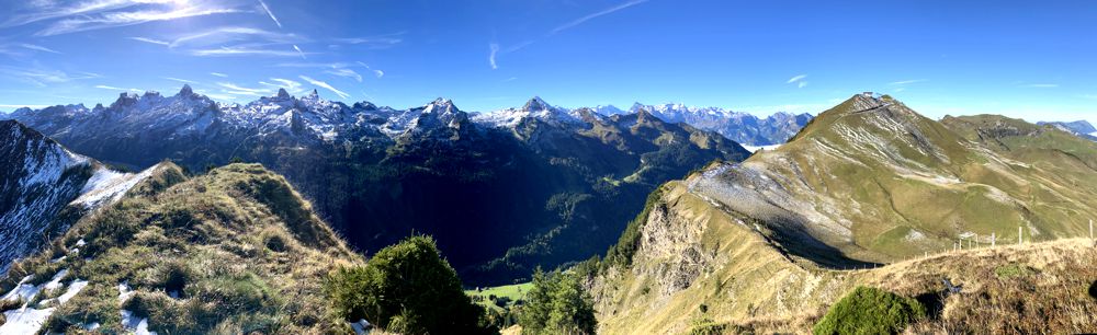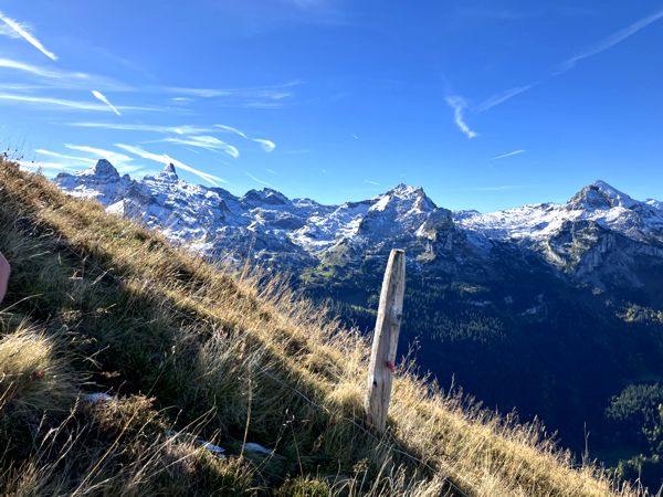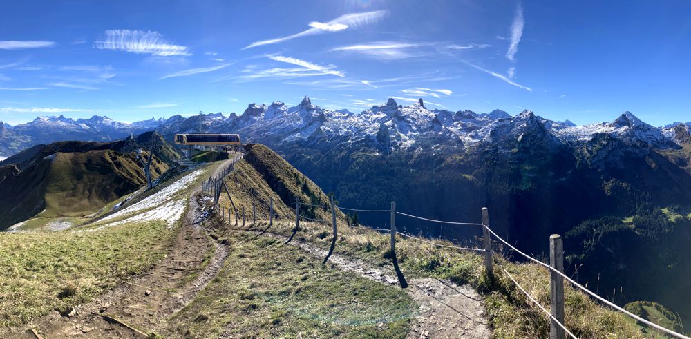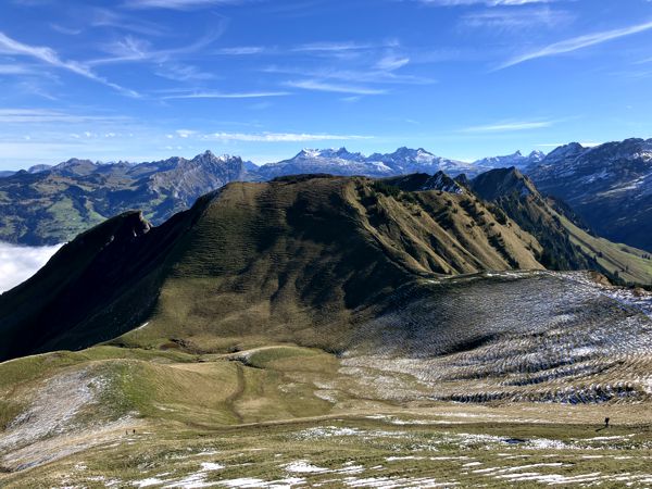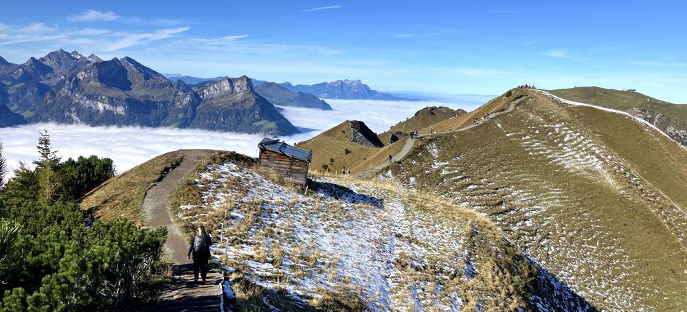 Der direkte Weg führt auf den Klingenstock, aber ein kleiner Abstecher führt auch auf den einsamen Chalberstöckli – der perfekte Platz für ein Frühstück an diesem Morgen. Über die steilen Wiesen des Chalberstöckli geht’s über einen Sattel vorbei an der Seilbahnstation hinauf zu Aussichtsplattform des Klingenstock. Ab hier ist man nicht mehr allein, denn die Seilbahn bringt kontinuierlich Nachschub an Wanderern nach oben. Der Blick über die umliegenden Berge war atemberaubend. Die Sonne schien, der Himmel war blau und die umliegenden Gipfel waren vom ersten Schnee des Winters weiß überzogen.
