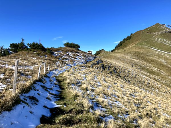 Zunächst durchquerte ich den Ort, der hauptsächlich aus Hotels bestand, die sich auf die anstehende Wintersaison vorbereiteten. Der Weg beginnt im Dorf quert eine ansteigende Wiese und führt dann auf einem breiten Wirtschaftsweg unterhalb der Seilbahn hindurch zur Metzg Hütte. Nach der Hütte beginnt über die Almwiesen ein steiler Aufstieg zwischen Chalberstöckli (1883 m) und Klingenstock (1935 m).