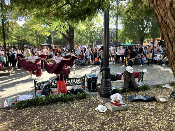 Ich/wir haben uns den Plaza Hidalgo angeschaut. Es handelt sich dabei um einen großen schattigen Park in dessen Mitte sich ein Brunnen mit 2 Coyotenfiguren befindet. Es waren viele Menschen unterwegs und es wurde Livemusik gespielt. An einer Stelle befanden sich zahlreiche schaurig schöne Skelete, die an den Día de los Muertos erinnerten. Um den Park herum gab es zahlreiche Straßenstände, die unglaublich leckeres Essen verkauften. Riesige gedünstete Maiskörner mit Chili, selbst gemachtes Eis oder einfach gefüllte Tacos.