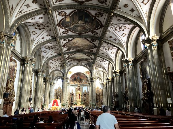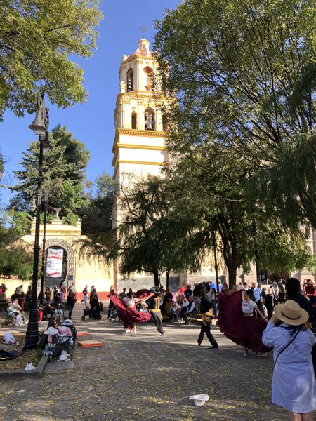 Vor der prächtigen Kirche Parroquia San Juan Bautista wurden mexikanische Tänze in Tracht aufgeführt. Die Kirche ist ein Ort der Stille und Ruhe. Der Trubel auf dem Platz davor wird hier drinnen, in angenehmer kühler Umgebung, komplett ausgeschlossen.
