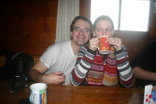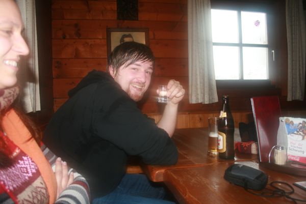 Der Schnee reichte uns auf dem ungeräumten Waldweg bis über die Knöchel. Die Flocken waren groß. Die Sicht betrug im Wald nur wenige Meter. Auf halber Strecker kaum uns der erste Rodler entgegen. War es ein Leihschlitten? Hatte die Alm geöffnet? Nach 50 Minuten erreichten wir durchgeschwitzt die Hütte. Die erste Tür war verschlossen. Es war - der Hintereingang. Vorn war offen. Der Gastraum war gut besucht. Es war warm und wir bestellten heiße Schokolade und genossen die Wärme.