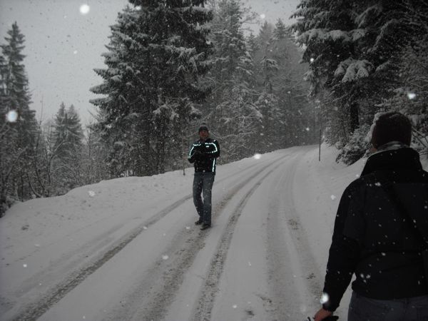 Der Winter meldete sich im warmen und durchföhnten Norden des Alpenvorlandes mit voller Wucht zurück. Noch wenige Tage zuvor war alles Grün und der Himmel blau. Am Samstagmorgen zeigten sich die ersten Schneekrümel. Schnell wurden es mehr. Aus den Krümeln wurde eine dichte Schneedecke. Von Rosenheim fuhren wir im zähflüssigen Verkehr Richtung Österreich. Ab Kufstein waren die kleinen Nebenstraßen kaum noch geräumt. Auf halbem Wege zum Gasthof Schneeberg in Thiersee streikten meine Winterreifen und ich konnte mich nur noch zurück in eine Parklücke gleiten lassen. Eva kam mit ihrem Auto ein Stück weiter, aber irgendwann mussten alle laufen. Im dichten Schneetreiben wanderten wir die ersten 1-2 km die steile Straße bis zum Gasthof hinauf (970 Hm). Von hier aus ging es dann nochmal vier weitere Kilometer einen kurvenreichen Waldweg bis zur Kala Alm auf knapp 1370 Hm hinauf (Pentling). Auf dem Weg begegneten uns nur wenige Rodler. Hatte die Alm bei diesem Wetter auch wirklich geöffnet?