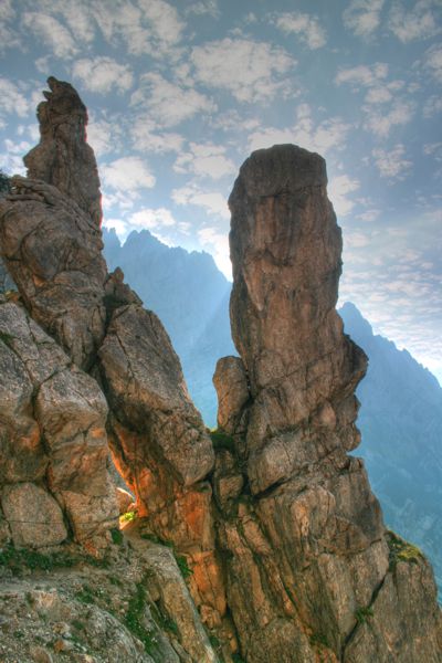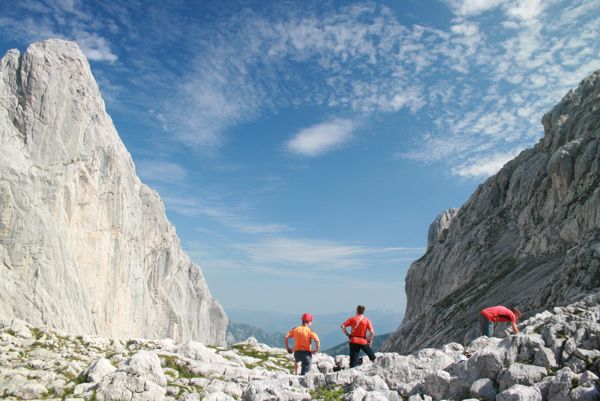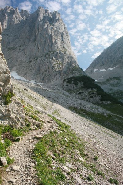 Der Weg führte zunächst im schattigen Wald steil bergauf. Nach ca. 30 Minuten verlässt man den Wald und steht schon fast vor der Gruttenhütte. Von der Hütte aus besteht die Möglichkeit den mittelschweren Klettersteig zur Ellmauer Halt, dem höchsten Gipfel im Wilden Kaiser, zu beginnen oder den einfachen Jubiläumsklettersteig zum Ellmauer Tor zu folgen. Da ich keine Klettersteigausrüstung dabei hatte und mich die Fotos im Internet doch etwas zurückschreckten, entschied ich mich für den Weg zum Ellmauer Tor. Der Jubiläumssteig ist ein nicht vollständig gesicherter einfacher Klettersteig. An vielen Stellen gibt es Stahlseile und teilweise auch Leitern. Der Weg führt fast immer in großer Höhe an einem sehr steilen Abhang entlang und ist von vielen kleinen losen Steinen übersät und deshalb sehr rutschig.