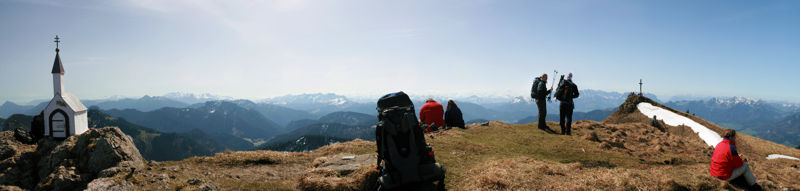 Schon während des Aufstiegs schweiften meine Blicke immer wieder in die Ferne. In Richtung Norden breitet sich der riesengroße Chiemsee direkt vor einem aus. Der Blick in Richtung Westen zeigt die Hochplatte und dahinter die zerklüftete Kampenwand. Wendet man den Blick weiter nach Süden, dann sieht man aus einer sehr ungewöhnlichen Perspektive den Zahmen und den Wilden Kaiser. Direkt im Süden konnte der Frühling den Bergen noch nichts anhaben, denn dort breiten sich die schneebedeckten Gipfel der Hauptalpen aus.