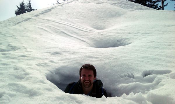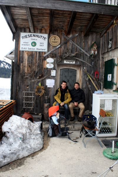 Den ersten Versuch unternahm ich gemeinsam mit Markus und Simon Mitte April über einen Aufstieg von Aschau aus. Vor einen Jahr war im April kaum noch Schnee in den Voralpen. Dieses Jahr sah es anders aus und nach jedem längeren Regenschauer im Tal, waren die Berge wieder weiß. Wir wagten dennoch den Aufstieg und stiegen in mehrere Serpentinen hinauf zur Hofalm. Ab der Alm gab es kaum noch Stellen, die nicht von Schnee bedeckt waren. Anfangs war der Schnee noch festgefahren, so dass wir gut vorankamen. Der Aufstieg zur Riesenhütte gestaltete sich dann schon schwerer, denn wir verließen den Waldweg und folgten einen Trampelpfad durch den tiefverschneiten Wald. Häufig sanken wir bis zu den Knien ein. Nur selten trugen uns die Spuren vorangegangener Wanderer. An der Riesenhütte, die von ca. 1,5 Meter hohen Schnee umgegeben war, legten wir unsere sehr späte Mittagspause ein, bevor ich mit Kind und Kraxe zurück nach Aschau lief und die anderen beiden den Aufstieg fortsetzen. Der Weg hinauf auf den Hochries wurde nicht einfacher und der Schnee immer höher. Der Rückweg war gar noch schwerer zu finden. Die 5-6 stündige Tour durch den Winterwald war dennoch sehr schön und sehr unterhaltsam.