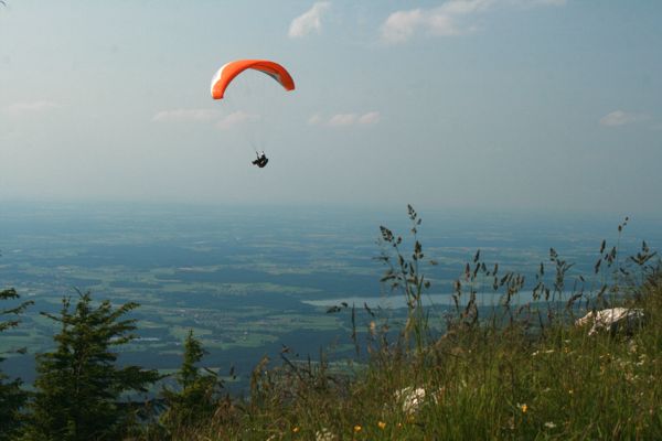 Da ich nun zwar oben war, aber eigentlich nichts gesehen habe, wollte ich mein Glück ein weiteres Mal herausfordern und bin Anfang Juli bei strahlendem Sonnenschein nochmals auf den Hochries gestiegen. Diesmal brannte die Sonne, am Himmel gab es kaum Wolken, aber dafür umso mehr Paragleiter und der Schweiß lief nur so in Strömen. Den Weg kannte ich mittlerweile ganz gut und kam dementsprechend schnell voran. Der Ausblick vom Gipfel ist wirklich traumhaft ... aber mal ganz ehrlich bei schönem Wetter einen Berg besteigen, dass kann ja wohl jeder.