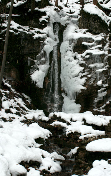 Fuße der Burgruine Falkenstein. Vorbei an vereisten Wasserfällen