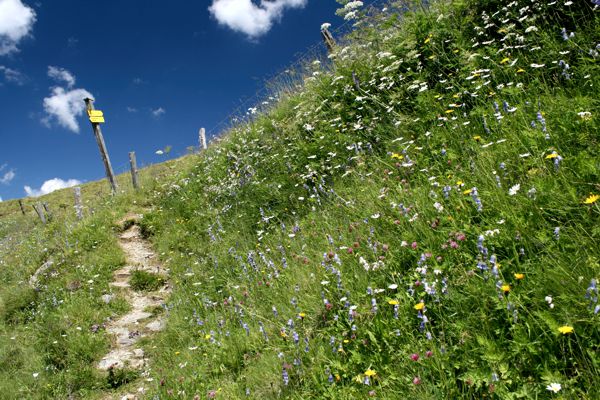 Wiesen voller Blumen unter blauem Himmel.
