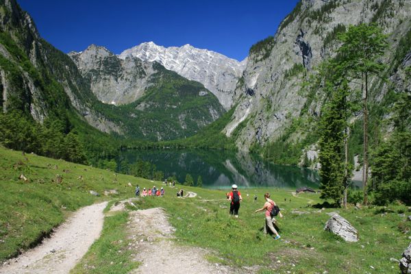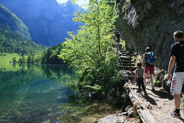 Der Weg bis zum Obersee vorbei an der Saletalm und entlang des Saletbachs war einfach. Der See, eingerahmt in hohe Felswände, lag wie ein Spiegel vor uns. Auf der anderen Seite des Obersees, lag die Fischunkelalm und noch ein Stück weiter, stürze der Röthbach-Wasserfall mit 470 m in die Tiefe (höchster Wasserfall Deutschlands). Auf der Westseite des Sees verlief der schmale Wanderweg zunächst auf Seehöhe. Ab der Hälfte, mussten wir zahlreiche Stufen in die Höhe steigen (und anschließend wieder hinab), was uns einen tollen Blick über den See verschaffte.