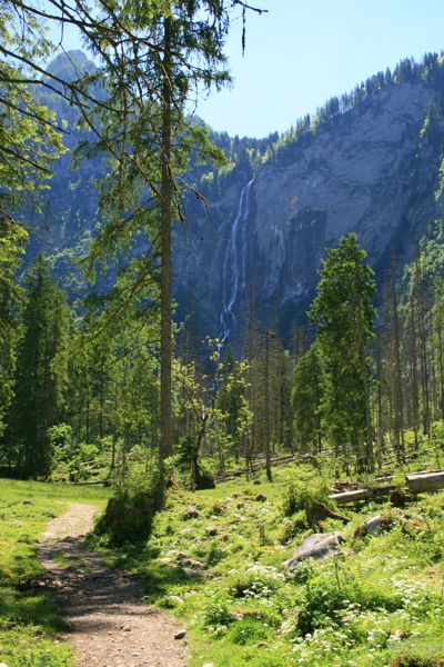 Vom Ende des Obersees führte ein schmaler Weg über eine steile Almenwiese zum Röthbachfall. Wir durchquerten noch ein Waldstück, um dann auf einer kleinen Anhöhe vor dem Wasserfall zu stehen. Obwohl der Himmel wolkenfrei war, lag der Wasserfall noch immer im Schatten der Felswand und ließ sich nur schwer im prallen Licht der Sonne fotografieren. Wir hätten noch näher heran gehen können, aber aufgrund des gleichlangen Rückwegs verzichteten wir darauf. Das Wasser fließt von hier unterirdisch als Fischunkel weiter in den Obersee.