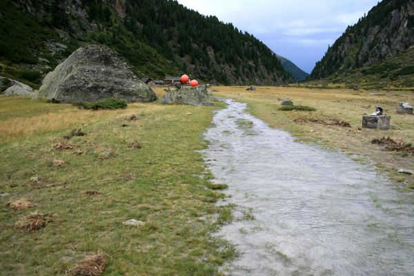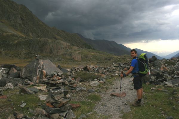 Da es langsam spät wurde und wir schon lange unterwegs waren, entschieden wir uns auf dem Sulzenauseerundweg hinab zur Blauen Lacke zu steigen und dann weiter zur Sulzenauhütte zu laufen. Während des Abstiegs verschlechterte sich das Wetter plötzlich. Über dem Gletscher waren dunkle Wolken aufgezogen und der Himmel über dem Nachbartal mit der Dresdner Hütte war fast schwarz. Donner war zu hören. Blitze zuckten. Wir beschleunigten unsere Schritte und erreichten die andere Seite der weggerissen Betonbrücke vom Morgen. Keine Chance den Bach hier zu queren. Es begann zu regnen. Wir stiegen schnell weiter ab und fanden in der Nähe der Sulzenauhütte zwei provisorische Stege über den Bach. Die dunklen Wollen vom Nachbartal waren jetzt direkt über uns. Wir erreichten die Hütte gerade noch bevor der heftige Wolkenbruch losbrach.