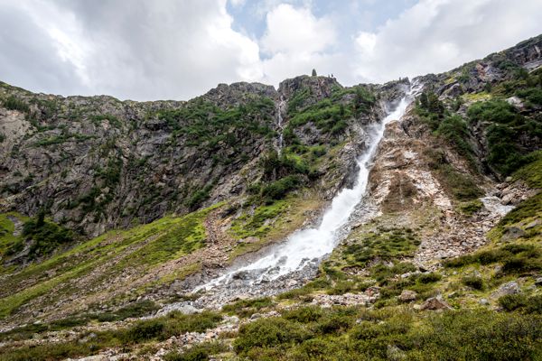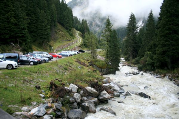 Der Weg war jetzt deutlich schlammiger. Der Wasserfall unterhalb der Sulzenauhütte war jetzt wirklich kraftvoll und führte sehr viel Wasser. Im Tal der Sulzenau Alm war der Sulzaubach über die Ufer getreten und hat den daneben liegenden Weg geflutet. Wir mussten auf die daneben liegende Wiese ausweichen, um das Tal wieder zu verlassen. Ab dem Gwara Wasserfall konnten wir sehen wie immer mehr Wolken in das Stubaital drängten. Als wir gegen 19:30 Uhr ziemlich erschöpft das Auto erreichten, waren die Berge hinter dichten Wolken verschwunden.