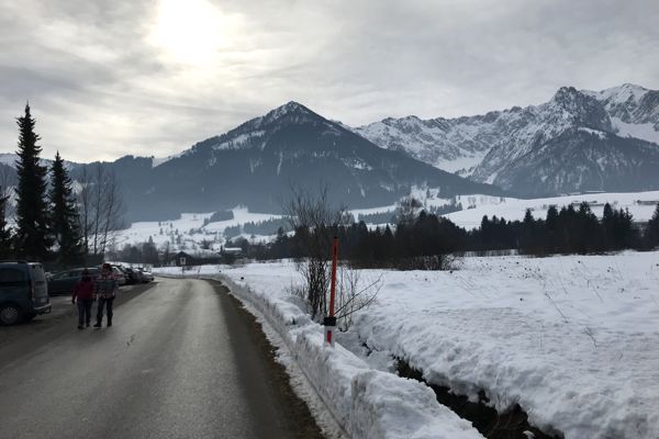 Am Morgen war es noch dunkel. Kurz vor 8 Uhr erreichte ich den Walchsee. Am Ortseingang vor den Tennisplätzen bog ich in die schmale Bergstraße in Richtung Oed ein. Ab Oed war die Straße nur noch mit Schneeketten zu befahren und die Straße nur noch einspurig. Keine Chance zum Wenden oder den Wanderparkplatz weiter oben zu erreichen. Um zu parken, musste ich zurück an die Tennisplätze in Walchsee fahren und dann die 2,5 km bis hinauf zum Wanderparkplatz laufen.