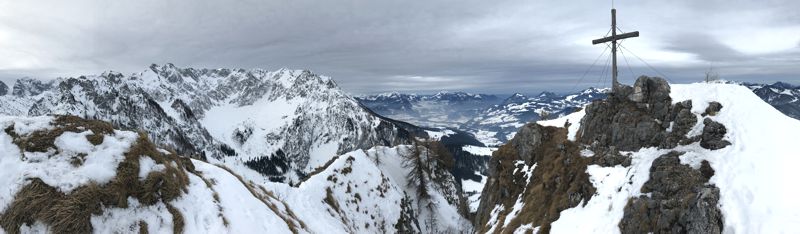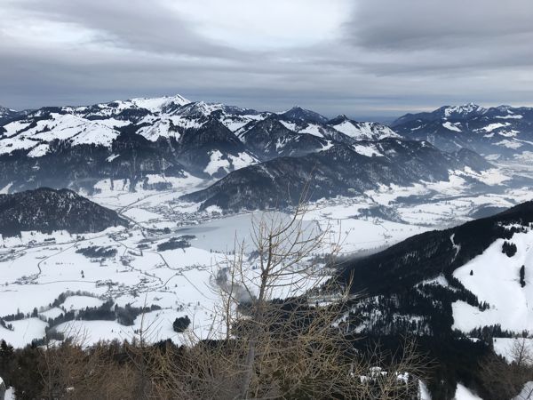 Der Gipfel eröffnete einen Blick in die winterlich verschneite Landschaft des Zahmen Kaisers. Der Himmel war grau. Vor mir breiteten sich das Winkelkar und die Pyramidenspitze (höchster Punkt im Zahmen Kaiser) aus. Die dunklen Felsen waren kaum zu erkennen. Mitten am Berg bewegte sich eine kleine Gruppe Skitourengeher langsam bergauf. Im Norden lag im Dunst der zugefrorene Walchsee mit dem Geigelstein im Hintergrund.