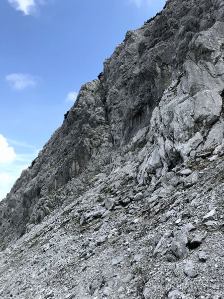 Ich erreichte die Hütte kurz nach 8 Uhr, als die ersten Wanderer gerade vor die Tür traten. Der Weg zum Mitterkaiser ist nicht offiziell ausgeschildert, aber Richtung Norden führt ein ca. 300 m langer Weg auf eine deutlich sichtbare senkrechte Rinne zu. Die steile und lange Rinne ist der einzige Weg, um auf den Mitterkaiser zu gelangen. Mit leichten und besonnen Kraxelein im zweiten Schwierigkeitsgrad (nach UIAA) gelangte ich langsam immer höher. Oberhalb der Rinne befanden sich Latschenkiefern und kleine steile Wiesenabschnitte. Der Weg zum Gipfel war leicht zu finden.