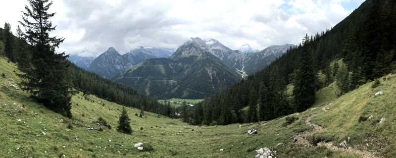 Im Inntal waren immer noch viele Wolken unterwegs. Ab und zu konnte ich in einer Wolkenlücke einen Blick auf weiße Gipfel werfen. Am Achsensee war das Wetter etwas freundlicher. Ich zahlte die Mautgebühr für die Straße in die Karwendeltäler und parkte an der Pletzachalm (eingezäunt als Schutz vor den Kühen).