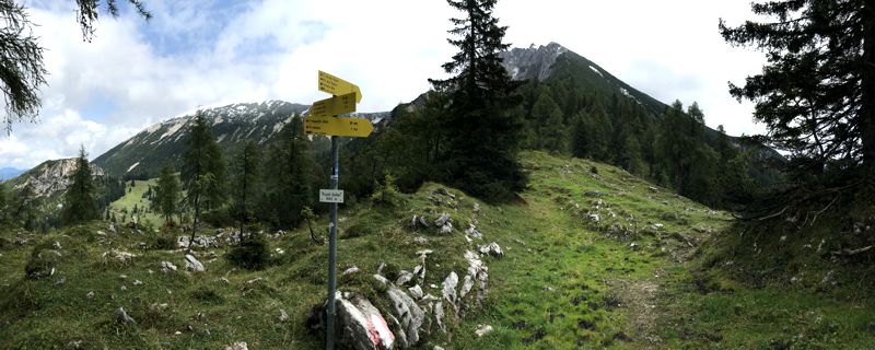 Auf die Seebergspitze führen viele Wege. Die meisten davon sind lang. Ein kurzer aber knackiger Weg ist der Zustieg ab der Pletzachalm. Vorbei an der Alm führt der Weg nach links in den Wald hinein. In unzähligen Serpentinen, erst im Wald, später über einen steilen Grashang, führt der Weg hinauf zum Pasillsattel (1682 m). Mit zunehmender Höhe wird die Aussicht ins Tal immer besser. Die Spitzen der umliegenden Berge verschwanden aber immer noch hinter den Wolken, so dass ich nicht viel vom Karwendel zu sehen bekam.