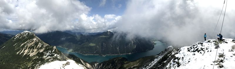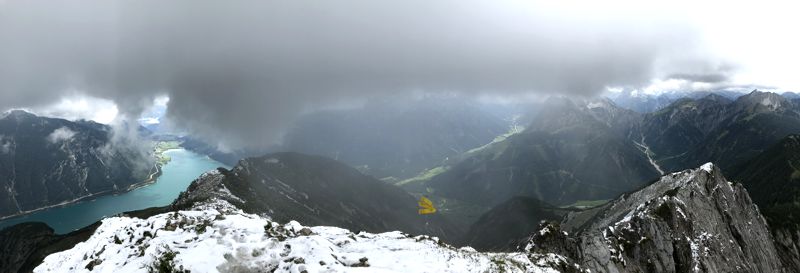 Alle Gipfel oberhalb 1800 m verschwinden in den Wolken oder erstrahlen in Weiß. Unter mir liegt der türkis leuchtende Achensee mit unzähligen kleinen weißen Booten. Im Osten liegt das Rofan mit dem Hochiss (2299 m) als höchsten Berg. In kürzester Zeit wechseln sich Sonne und dunkle Wolken am Gipfel ab. Mal habe ich einen herrlichen Ausblick und im nächsten Moment sehe ich gar nichts mehr. Ursprünglich hatte ich geplant auch die Seekarspitze zu besteigen, aber aufgrund des Schnees kann ich den Weg hinab von der Seebergspitze nicht ausmachen. Wie sich das Wetter in den nächsten Stunden verhalten würde, ist auch nicht abzusehen. Abstieg wie Aufstieg.