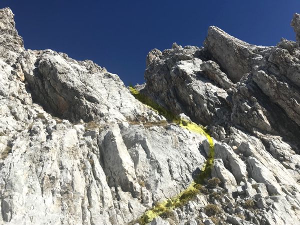 Das Geröll im Kamin war nur der Vorgeschmack auf den weiteren nicht vorhandenen Weg. Es gab unzählige kurze Wegabschnitte, Steinmandl waren kaum im Geröll auszumachen. Ich näherte mich einer steilen Rinne, die bis auf 2600 m hinaufführte. Ich stieg neben der Rinne im Geröll bis zu einem weiteren Grat hinauf, um dann mit dem finalen Aufstieg zu beginnen.