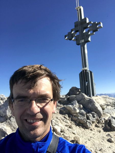 Irgendwann hatte ich den Weg komplett verloren und halte mich wie bisher auch tendenziell rechts. Ich überkletterte viele kleine Absätze. Ich trat sehr viel Geröll los und kam nur langsam voran. Kurz vor dem Gipfel habe ich wieder einen Weg gefunden und war dann pünktlich zum Mittagessen nach 5 Stunden auf Deutschlands zweihöchsten Berg mit Blick auf den höchsten Berg. Nicht weit entfernt befand sich das Zugspitzhaus, der Restgletscher und Skilifte.