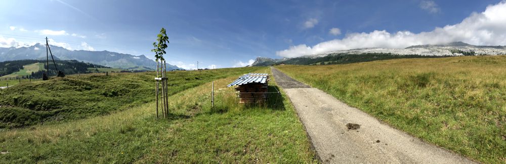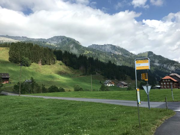 Ich begann meine Wanderung an der Bushaltestelle Hirsegg in Sörenberg. Von der Straße blickte ich zur deutlich sichtbaren Schrattenflue hinauf. Zunächst war ich etwas irritiert, denn der hellgraue Kalkstein wirkte, als wären die Flanken des Gebirgsstocks noch mit Schnee bedeckt. Ich überquerte auf einer kleinen Straße einen Bach und stieg hinter einigen Häusern einen gut markierten Weg Richtung Alp Schlund hinauf. Der Weg wechselte zwischen steilen Wiesen (mit und ohne Kühe), Wirtschaftswegen, kleinen Waldstücken und Boardwalks.