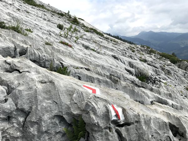An der Alp Schlund teilte sich der Weg. Ich folgte dem Wirtschaftsweg Richtung Norden bis zur Alm Silwängen. Ab der Alm wurde der Weg zum schmalen Bergpfad, der schnell an Höhe gewann. Schon bald ließ ich nicht nur die Bäume hinter mir, sondern auch das schöne Wetter. Das Kalkgestein ist tief eingefurcht, ist aber auch sehr griffig, so dass es bis zum Heideloch (1933 m) schnell weiter hinauf ging. Hinter den tiefhängenden grauen Wolken zeigte sich ab und zu schemenhaft der Hengst (2092 m), die höchste Erhebung des Gebirgsstocks. Auf dem Hengst, den ich nach 2,5 Stunden erreicht hatte, gab es ein Gipfelkreuz, aber absolut keine Aussicht. Die Westseite des Berges fiel steil in die Tiefe hinab.