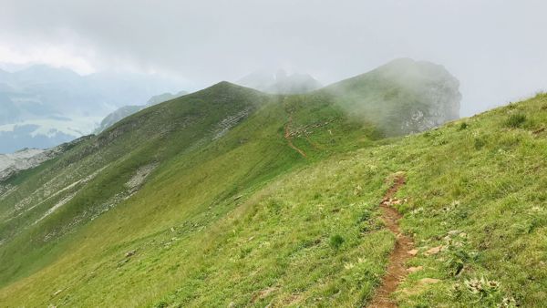 Der Kammweg führte anschließend Richtung Süden vorbei am markanten Türstehäuptli (2031 m) bis hin zum Schibengütsch (2037 m). Die Sicht wurde allmählich wieder besser, so dass ich die nähere Umgebung genießen konnte. Ein Fernblick auf die Berner Alpen blieb mir jedoch bis zum Schluss verwehrt. Vom Schibengütsch stieg ich einen steilen Hang hinab zu Chlus Alm und kehrte von dort zurück zu Alp Schlund, von wo aus ich den gleichen Weg wie beim Aufstieg zur Bushaltestelle Hirsegg folgte.