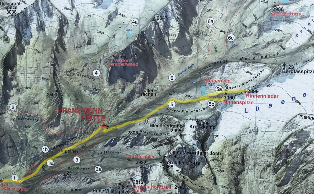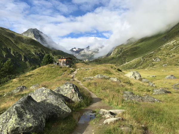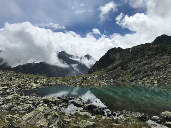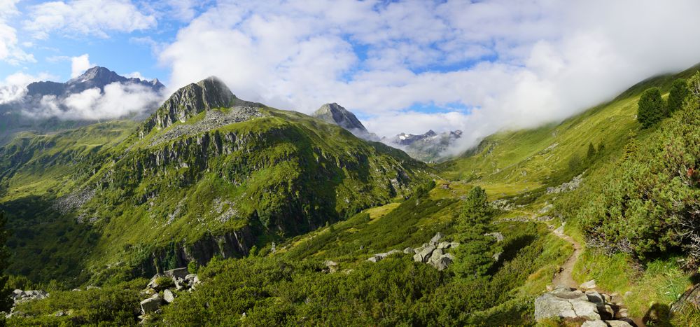 Hinter der Franz-Senn-Hütte führt der Weg an einem grasigen Hang in die Höhe. Oberhalb eines Wasserfalls führt der Weg dann lange auf gleicher Höhe immer weiter zum Berg hin. Bei meiner Wanderung sammelten sich hier die ersten Wolken und von dem schönen wilden Oberbergtal war nur noch teilweise etwas zu sehen. Am Ende des Tals erhebt sich der mächtige Alpeiner Ferner Gletscher. Ich überquerte zahlreiche kleine Bäche bis zu einem weiteren Abzweig, wo ich mich zwischen der Rinnenspitze und dem Rinnensee entscheiden konnte.