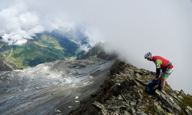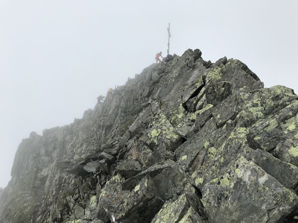 Der Klettersteig, der durchgängig mit Drahtseil gesichert war, wurde jetzt deutlich ausgesetzter, denn auf beiden Seiten ging es mehrere hundert Meter senkrecht in die Tiefe. Nach einer kniffligen, aber gesicherten, Kletterstelle auf dem Nordostgrat, folgt der Weg links unterhalb des Gipfels bevor das Seil dann zum Gipfelkreuz aufsteigt. Von hier oben soll man theoretisch einen traumhaften Blick auf die Gipfel des Stubai haben, aber ich konnte nur unten auf den Lüsener Ferner schauen. Alle anderen Gipfel verbargen sich hinter den Wolken. Der Klettersteig ist ohne Klettersteigset machbar, aber wer sich unsicher fühlt, sollte das Set benutzen. Der Gipfel ist klein und bei großem Andrang, kann es zu Wartezeiten und nicht einfachen Ausweichmanövern kommen.
