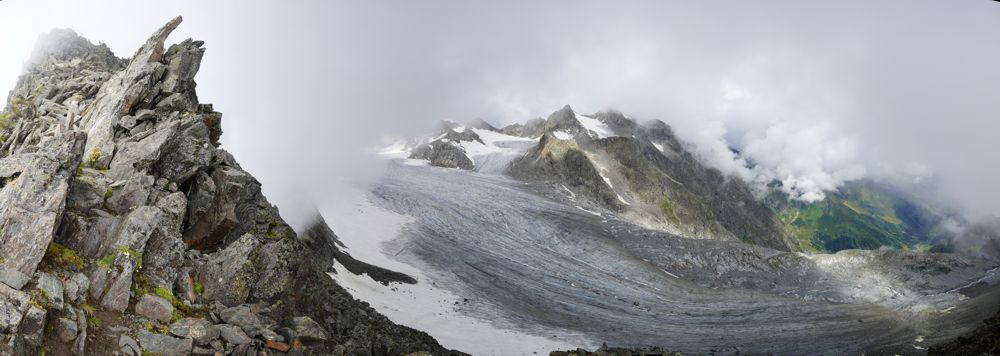 Laut Karte befindet sich die Weggabelung direkt am Fuß der Rinnenspitze, aber aufgrund der Wolken konnte ich den Berg nur erahnen. Der Weg führte jetzt über größere und kleinere Blöcke steil nach oben. Unterhalb des Gipfelgrats beginnt der Klettersteig, wo zahlreiche Wanderer gerade im Abstieg waren. Die Sicht war sehr schlecht. Die Entfernung zum Gipfel nur zu erahnen. Das erste Stück des Klettersteigs war einfach und nicht ausgesetzt. Auf dem Gipfelgrad angekommen, hatte ich einen tollen Blick auf den mächtigen Lüsener Ferner auf der Rückseite der Rinnenspitze.