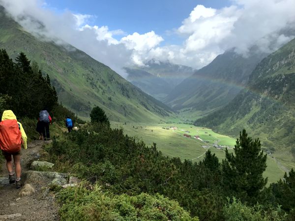 Der anschießende Abstieg vorbei an der Franz-Senn-Hütte bis zum Auto war lang. Das Wetter wurde immer schlechter und es nieselte fast durchgängig. Kurz vor dem Parkplatz besserte sich das Wetter und ein Regenbogen erstrahlte über dem Oberbergtal zum Abschied.