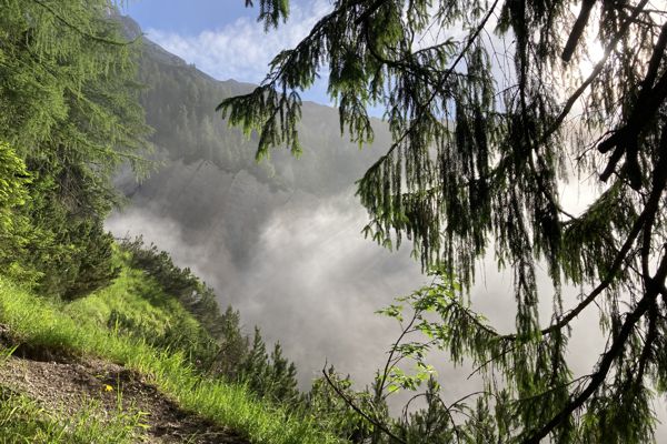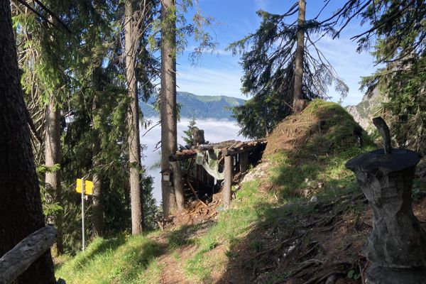 Der Hochzint (2246 m) ist ab der Passauer Hütte einer der wenigen Gipfel, der ohne zusätzliche Kletterausrüstung zu erreichen ist. Meine Wanderung startet am Wanderparkplatz in Ullach (Passauer Hütte). Der Weg (ausgeschildert mit 3:30 h) führt steil durch einen Wald einen Bergrücken hinauf. Am Morgen startete ich unter einer dichten Wolkendecke, die sich in alle Täler hineinzog. Kurze Zeit später war ich direkt in den Wolken im Nebelwald verschwunden. Die mit einer Kettensäge aus Holz geschnitzten Tiere (Bären, Eulen, Murmeltier, …) wirkten mystisch.