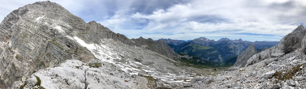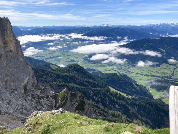 Die Aussicht vom Gipfel ist atemberaubend. Im Süden die schneebedeckten 3000er. Im Westen das mächtige Birnhorn (begehbar über Klettersteig) und Norden und Osten eine Hochebene mit der Passauer Hütte am Rand, die an das Steinerne Meer erinnert. Tatsächlich befindet sich in der Ferne die prominente Watzmann Gebirgsstock mit seinen drei Hauptgipfeln. Davor befindet sich der Große und Kleine Hundstod.