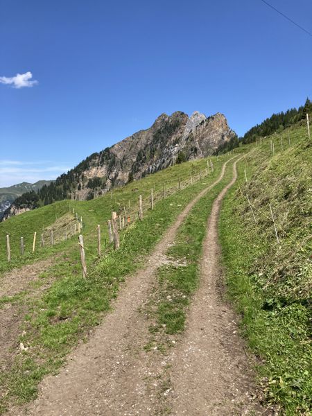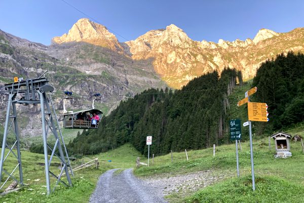 Die Musenalp befindet sich auf 1483 m Höhe und kann in 50 Minuten erwandert werden. Ich entschied mich die 300 Höhenmeter zu sparen und mit der offenen Luftseilbahn in die Höhe zu gleiten. Die Bahn bestand aus einer kleinen überdachten Gondel mit Platz für Gepäck und 4 Personen und fährt ab 7 Uhr jede Stunde, solange bis alle Leute weg sind. Um die Bahn nach unten zu rufen, wird geklingelt und bezahlt wird oben an der Alm mit 8 CHF für Auf- und Abfahrt.