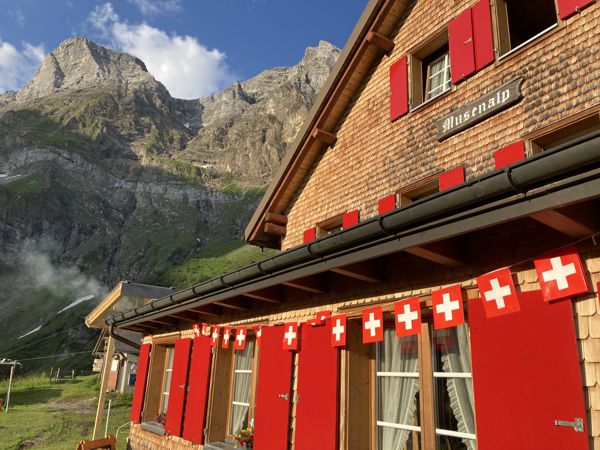 An diesem Tag herrschten perfekte Wetterbedingungen. Nach Ankunft an der Musenalp, die alle Klischees an eine Schweizer Berghütte mit Kühen und ganz vielen Schweizer Fahnen erfüllte, tauchte die Sonne die Landschaft gerade in goldenes Morgenlicht.