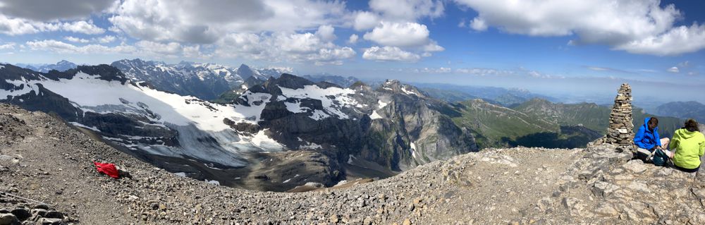 Bis zum Erreichen der Scharte führt der Weg durch ein Tal mit begrenzter Aussicht. Ab der Scharte breitet sich der riesiger Blüemlisalpfirn Gletscher vor einem aus und der Blick schweift weiter zu Wissigstock, Titlis und ganz am Horizont Eiger, Mönch und Jungfrau. Der weitere Weg bis zum Gipfel ist ein gut ausgetretener Schutzpfad mit kurzen Blockklettereien. Der Gipfel bietet viel Platz und vor allem ein unglaubliches Panorama. Im Süden und Westen liegen die schneebedeckten Gipfel der 3000er und 4000er. Im Norden und Ostern erstreckt sich 2500 Meter tiefer der Vierwaldstättersee, der von Schweizer Nationalbergen wie Pilatus, Stanserhorn und Rigi eingerahmt wird. Unglaublich schön und erhaben.