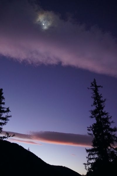 Der Weg führte als vom Mond beschienenes Band aus kleinen hellen Kalksteinen durch den dunkeln Wald. Auch ohne Stirnlampe gewann ich schnell an Höhe. Kurz nach 6 Uhr begannen sich die Wolken im Osten über den Bergen erst rot und später gelblich zu färben. In vollkommener Stille wurde es langsam heller. An der Trausnitzalm (1435 m) glühten die ersten Gipfel bereits rötlich. Ab der Alm wird der Weg deutlich steiler, ist aber bis zum Gipfel des Trausnitzberges, wie der Österreichische Schinder auch genannt wird, eine angenehme Bergtour.