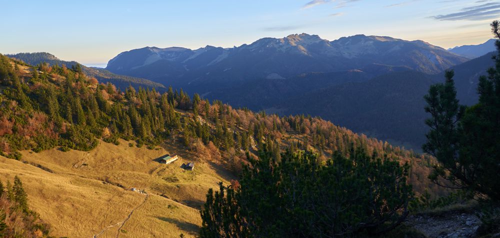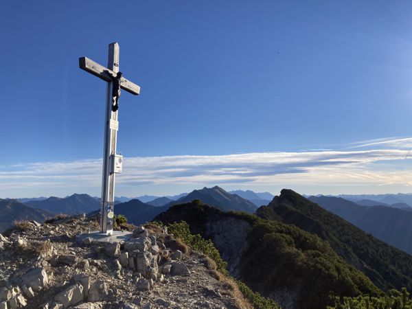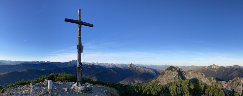 Der Blick ist am Morgen atemberaubend schön. Über den Tälern liegt noch der herbstliche Dunst der Nacht. Die Gipfel leuchten bereits im Sonnenlicht. Im Osten erhebt sich der Wilde Kaiser – gefolgt vom Hinteren Sonnenwendjoch. Im Süden liegen die schneebedeckten Gipfel des Alpenhauptkamms und gar nicht weit entfernt im Westen befindet sich der 12 m niedrigere Bayrische Schinder.