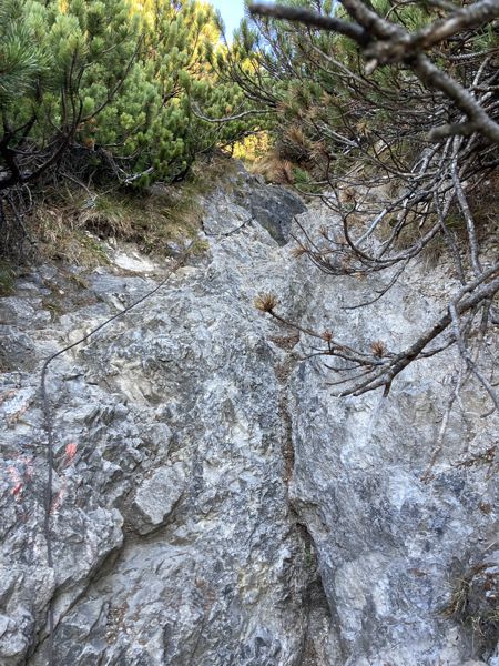 Der Weg zum zweiten Gipfel der heutigen Rundtour ist gar nicht so leicht zu erreichen, denn kurz nach dem Gipfel geht es 100 Hm eine drahtseilgesicherte steile Rinne hinab. Vorbei am späteren Abstieg nach Valepp schlängelt sich der steile Weg durch Latschen und über Wurzeln auf den Bayrischen Schinder hinauf (ca. 30 min Gehzeit zwischen den Gipfeln; ca. 2 h ab Wanderparkplatz).