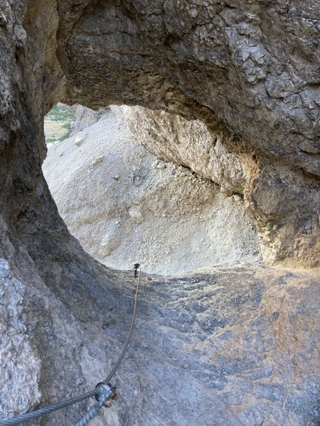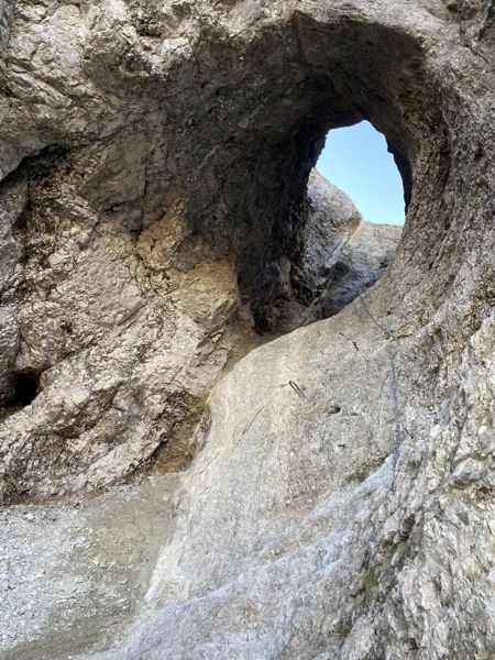 Der Abstieg führt zurück zum „Tor“ zwischen den beiden Schindern und dann sehr steil hinab durchs Schinderkar. Zum Teil gibt es Seilsicherungen, die den Abstieg etwas erleichtern. Ein Stück unterhalb des Tors muss eine kleine drahtseilgesicherte Höhle durchstiegen werden. Der weitere Abstieg führt über viel Schutt und Geröll wieder an den Wald heran. Der anschließende Abstieg durch den Wald führt über breite Waldwege bequem hinab zum Wanderparkplatz, der bei meiner Rückkehr gegen halb zehn bis zum letzten Platz gefüllt war.