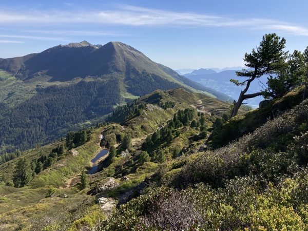 Blick zurück zum Loassattel mit Kuhmesser im Hintergrund.