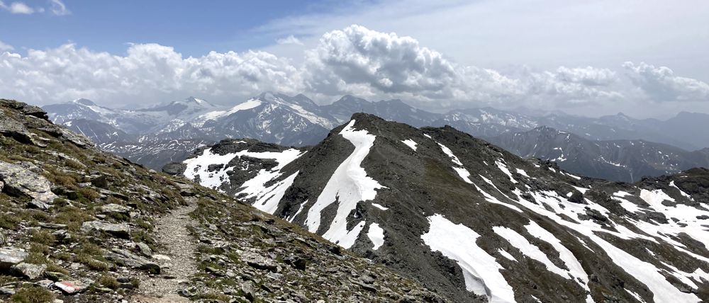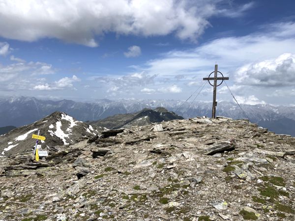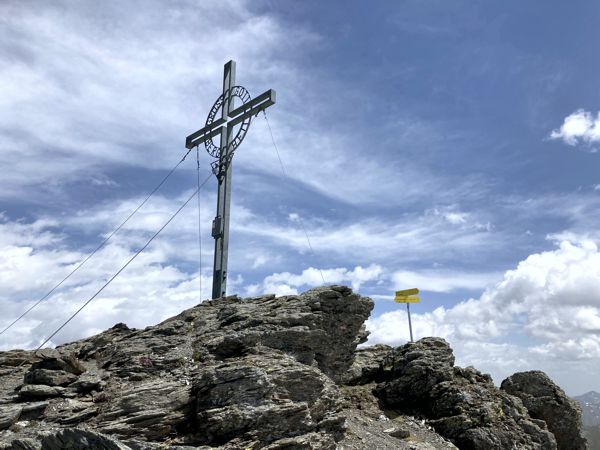 Der Blick von der Grünbergspitze war atemberaubend. Ich entschied mich einen weiteren Abstecher auf meiner Rundtour zu machen und den kurzen Weg hinüber zum Rosenjoch zu laufen (20-30 min). Der Weg war am Anfang leicht und führte in einen kleinen Sattel hinein. Dann ging es über eine etwas ausgesetzte Stelle, die mit Drahtseilen gesichert war, hinauf auf den nächsten Gipfel. So könnte es jetzt „endlos“ weitergehen. Der nächste Gipfel wäre die Kreuzspitze (2746 m), die wahrscheinlich auch in 20-30 Minuten zu erreichen gewesen wäre, aber ich musste meine Wanderung in dieser Richtung abbrechen. Wenn ich diesen Weg fortsetzte, würde ich mich immer weiter von der Rundtour und dem Parkplatz entfernen. Außerdem nahm die Bewölkung und der Wind immer mehr zu.