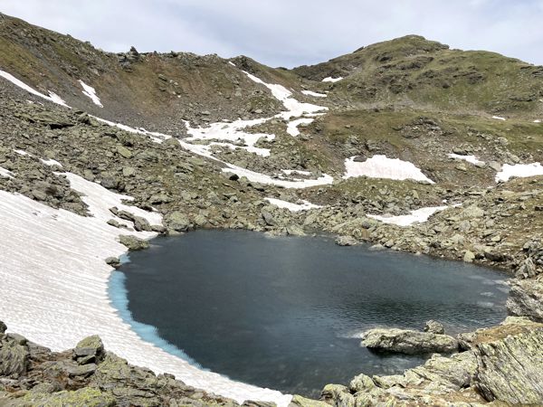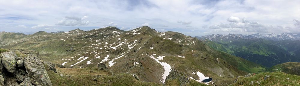 Ab der Seeblesspitze war der Weg nur noch sehr schlecht markiert bzw. es gab wieder größere Schneefelder, die den Weg verdeckten. Ich konnte keinen weiteren Wegverlauf auf dem Kamm zum Pfoner Kreuzjöchl (2638 m), von dem es definitiv einen Abstiegsweg ins Tal gab, ausmachen. Was nun? Weiter unten im Tal sah ich zwei größere Almenhütten. Die Almenwiesen waren steil, aber sahen dennoch normal begehbar aus. Ich entschied mich über die Almenwiesen direkt abzusteigen. Die erste Alm, die ich erreichte war die Vögeler Alm, die allerdings unbewirtschaftet war. An der Seapnalm, die ich schon beim Aufstieg oft ausgeschildert gesehen hatte, wies man mir die Richtung zum Parkplatz. Es gab einen steilen Serpentinenweg direkt durch den Wald, der fast beim Parkplatz Grün endete. Wieder zurück auf dem Forstweg von heute Morgen, war ich gegen 16:30 Uhr zurück am Auto. Das Wetter hatte sich weiter verschlechtert. Laut Wetterbericht sollte es ab 17 Uhr regnen. 17 Uhr begann tatsächlich ein Gewitter mit heftigem Regen, was die nächste Stunden anhielt. Gut, dass ich schon wieder unten bin und nicht mehr weitergegangen bin.