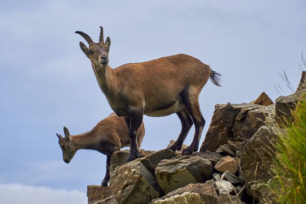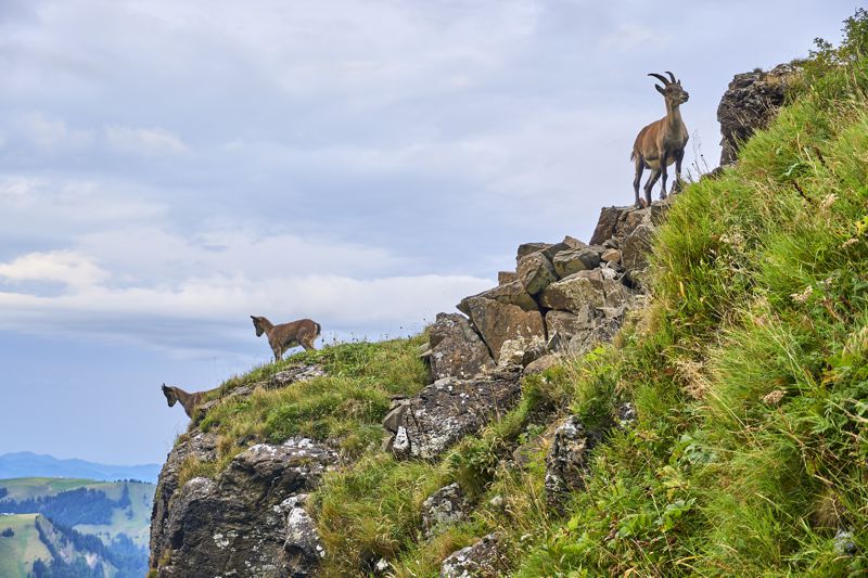 Ich gewann schnell an Höhe, als ich plötzlich über mir eine Gruppe von Gämsen ausmachte. Zunächst noch weit über mir, aber ohne Scheu. Ich stieg höher. Der Weg führte nur 15 Meter an den zwei Eltern- und zwei Jungtieren vorbei. Tolle Fotos! Durch einen grellen Pfiff gaben mir die Tiere zu verstehen, dass jetzt die Grenze ihrer Zutraulichkeit erreicht war.