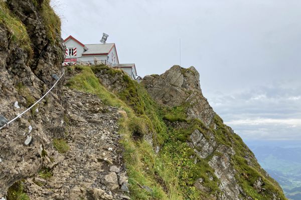 Der Gipfel des Säntis ist, wie leider so oft in der Schweiz, total zugebaut. Es gibt neben der Seilbahnstation ein riesiges Hotel und einen 123 Meter hohen Turm und alles ist in gelb gehalten und sieht sehr unförmig aus. Ich habe auf dem Hinweg „Per Anhalter durch die Galaxis“ gehört und da wurden die hässlichen Vogonen Raumschiffe als Gelb mit vielen Beulen beschrieben. Das Bauwerk auf dem Gipfel war gelb und hatte viele überdimensionale Beulen. Im Gebäude gab es verschiedene Ausstellungen zum Berg und Wetter sowie verschiedene Aussichtsterrassen.
