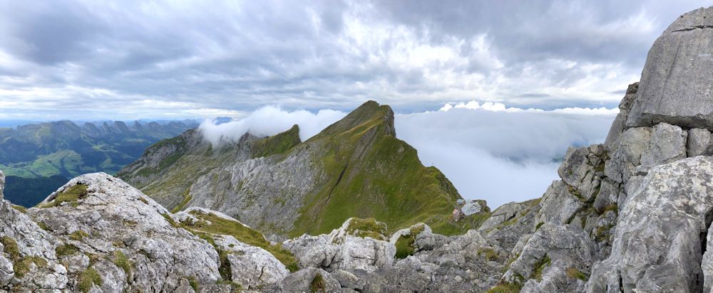 Die Wolken vom Aufstieg hatten sich mittlerweile verzogen und gaben einen grandiosen Blick über die Ostschweiz bis hin zum Pilatus, über den Zürichsee mit Rapperswil und über den gesamten Bodensee frei. Die Sonne schien und es war warm. Herrlich! Kurzzeitig spielte ich mit dem Gedanken über den Liesengrad hinüber und auf den Altmann zu steigen, aber ich war mir nicht sicher, ob ich das zeitlich alles schaffe, denn es sollte ja noch regnen, obwohl der Himmel aktuell tiefblau war. Ich genoss einfach die Aussicht und machte noch weitere Fotos.