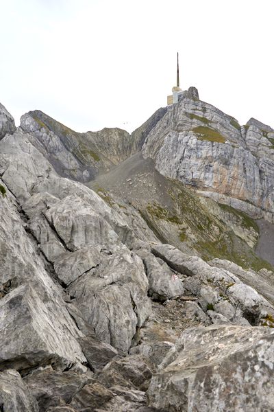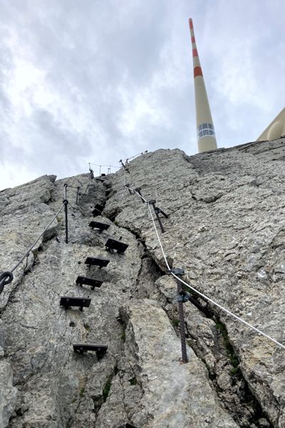Der weitere Weg war gut gesichert und führte unter der Seilbahn hindurch, die mittlerweile den Betrieb aufgenommen hatte. In mehreren Bändern zog sich der Weg über den glatten Fels nach oben bis zu einem Übergang, wo auf der andere Seite der Abstieg nach Wasserauen möglich ist. Ich folgte dem Weg zum Gipfel über die Himmelsleiter. Eine gut gesicherte (Tritte und Stahlseile auf beiden Seiten) Aufstiegsroute durch eine fast senkrechte Wand hinauf zum Gipfelaufbau. Nichts für schwache Nerven.