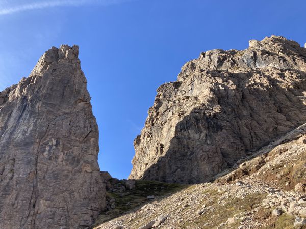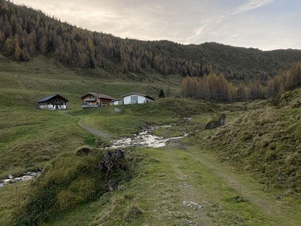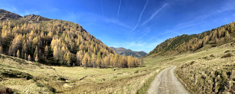 Der Abstieg erfolgt zunächst wieder durch das Aufstiegsschuttkar. Auf halber Höhe besteht die Möglichkeit in Richtung Süden zum Schöntaljoch (2030 m) abzubiegen und dann die lange Kammwanderung bis zu den Spießnägeln fortzusetzen. Da es von den Spießnägeln keinen Abstieg zur Käserei gab, wählte ich den Abstieg über das Rettensteinjoch (1928 m). Gegen Mittag erstrahlten die vielen Lärchen an der Schöntalalm im warmen gelb/braun.