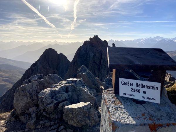 Der Weg führt zunächst unterhalb der Blaufeldköpfe (2074 m) entlang und geht dann in engen Serpentinen durch ein steiles Schuttkar zügig in die Höhe bis auf einen engen Sattel. Der Gipfel des Großen Rettensteins ist zweigeteilt. Südlich des Sattels befindet sich der Hauptgipfel, der nur mit viel Klettererfahrung zu erreichen ist. Der unwesentliche niedrigere „Wandergipfel“ befindet sich Richtung Norden und kann über kurze ungesicherte Kletterpassagen im ersten Schwierigkeitsgrad mit sehr tiefen Tiefblicken erreicht werden. Die Kaxelei ist schnell vorbei und der freistehende Gipfel entschädigt mit einem grandiosen Blick über die Umgebung. Am Morgen lagen die meisten Täler noch im Dunst, die Bergkuppen erstrahlten aber bereits im Sonnenlicht. In der Ferne leuchtete der weiße, schneebedeckte Alpenhauptkamm.