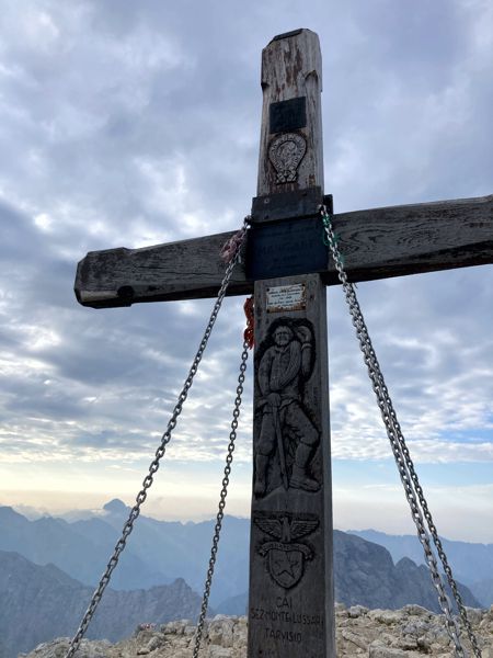 Der Weg stieg zunächst nur mäßig an und war leicht bis unterhalb des Kleinen Mangart zu laufen. Es folgt ein kleiner drahtseilgesicherter Aufstieg bis zu einer gut markierten Kreuzung. Hier trennt sich der Weg in den „Ital. Smer“ (links) und „Slow. Smer“ (rechts, schwierig & anspruchsvoll) – ich überschritt die Grenze und wählte den italienischen Weg. Es geht kontinuierlich steil, aber gesichert bergauf bis kurz vor einer senkrechten Wand, wo dann der Weg den Gipfel nördlich fast auf gleichbleibender Höhe quert. Nach der Querung erfolgt ein letzter steiler Aufstieg mit leichter Kraxelei bis direkt auf den breiten Gipfel mit Kreuz. Die Grenze zwischen Italien und Slowenien verläuft über den Gipfel, aber das Kreuz befindet sich auf slowenischer Seite.